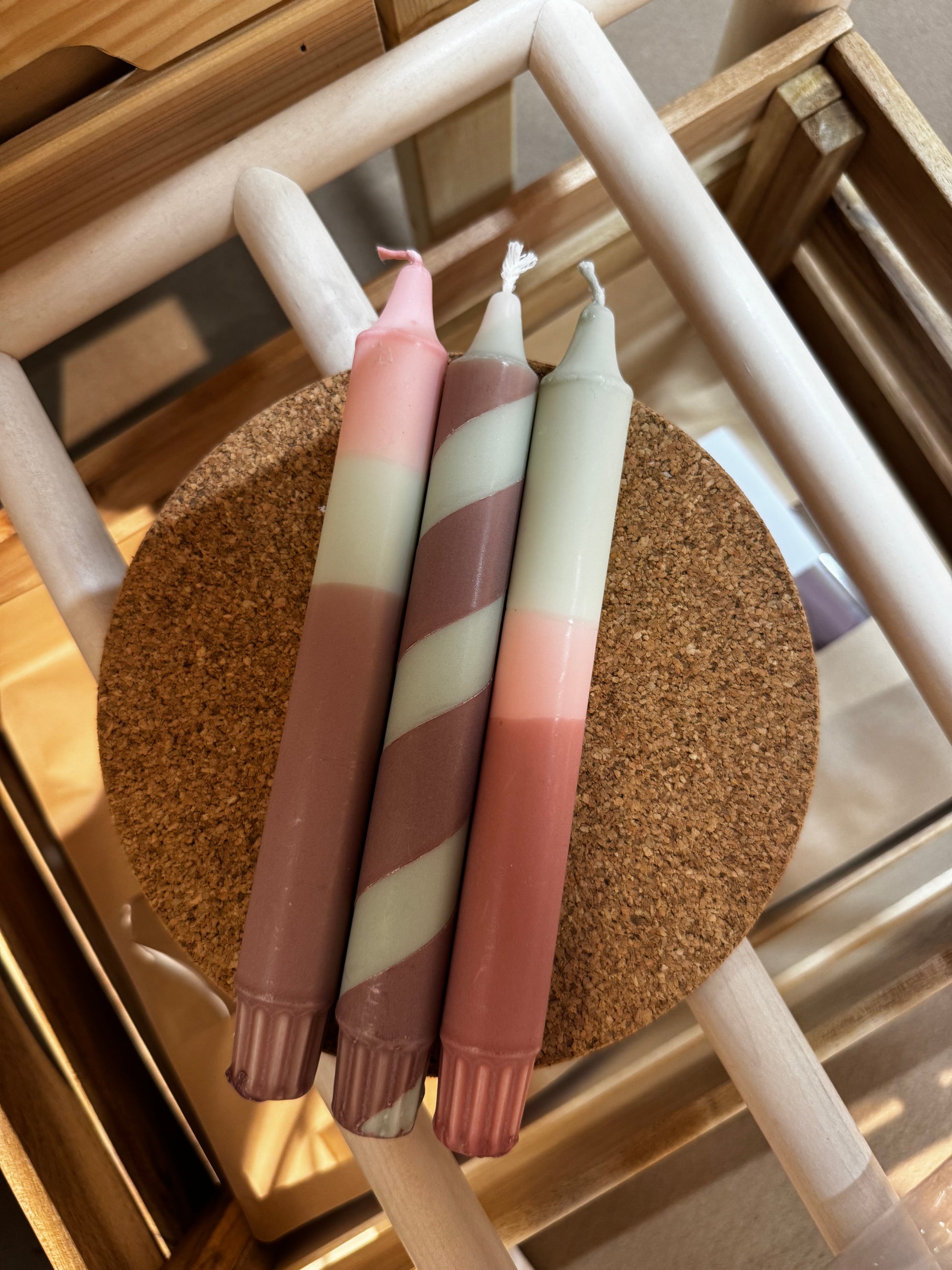 Minttua, suklaata ja ripaus vaaleanpunaista. Herkullinen kynttiläsetti niin lahjaksi kuin omaankin kotiin.